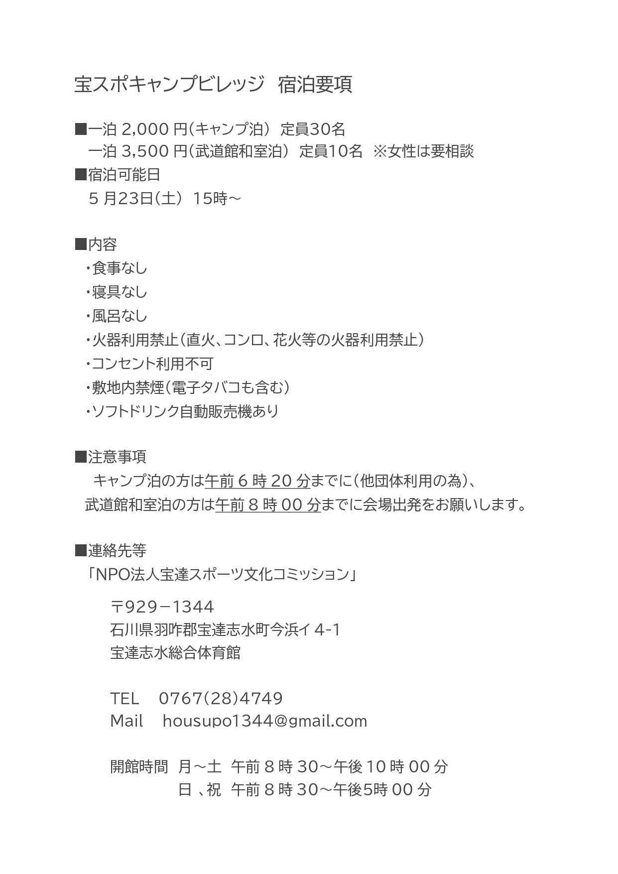 | 宝スポキャンプビレッジ | キャンプ泊 27人 武道館和室 9人 | 宿泊要項 キャンプ泊:2,000円 武道館泊:3,500円 | 宿泊予約 |